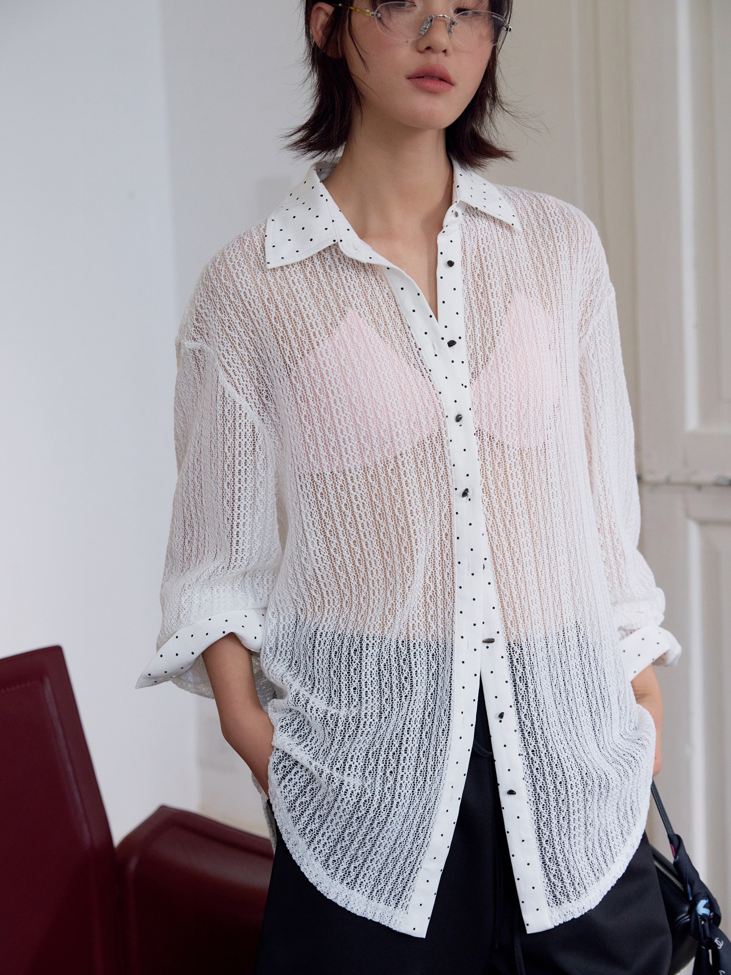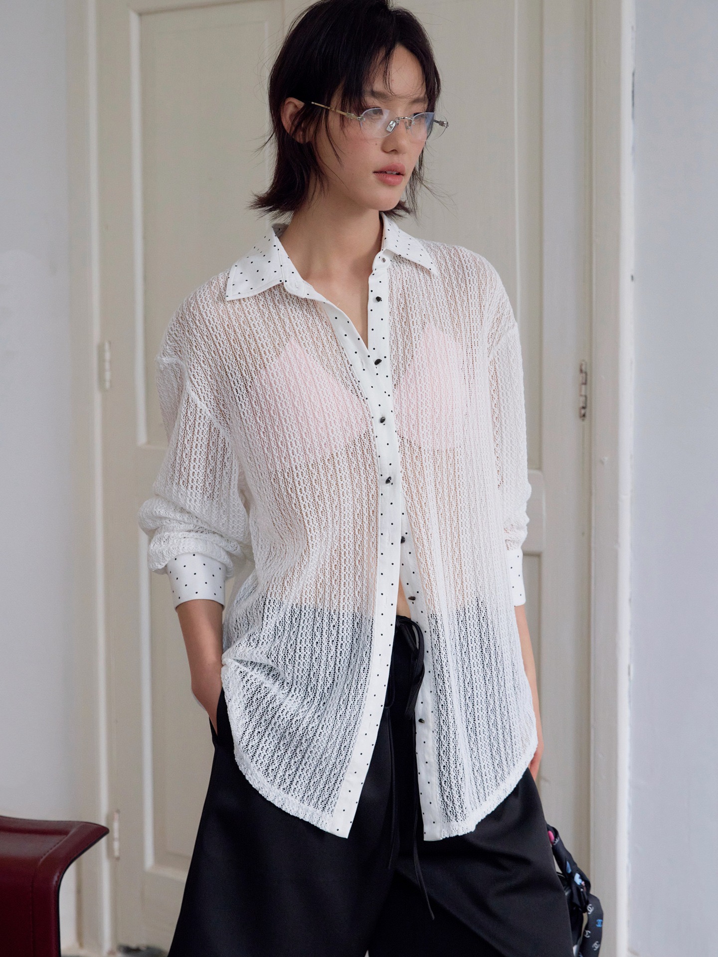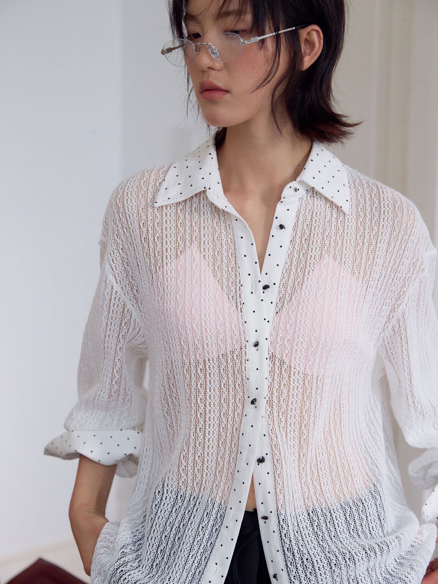 邊邊拼接點點 加上袖口金屬鈕扣